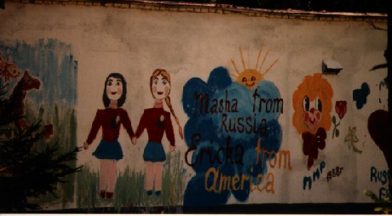 Раньше, лет девять тому назад, эта стена была красиво разрисована на тему дружбы между СССР и США. Сделали это американцы и русские во время приезда первых в Троицк. За два дня до отьезда байтиковцы вышли к этой стене, вооружившись баллончиками с краской, и украсили ее. Долго радовали глаз нарисованные на ней голуби, глобусы, руки, "пацифики" и прочие символы мира.